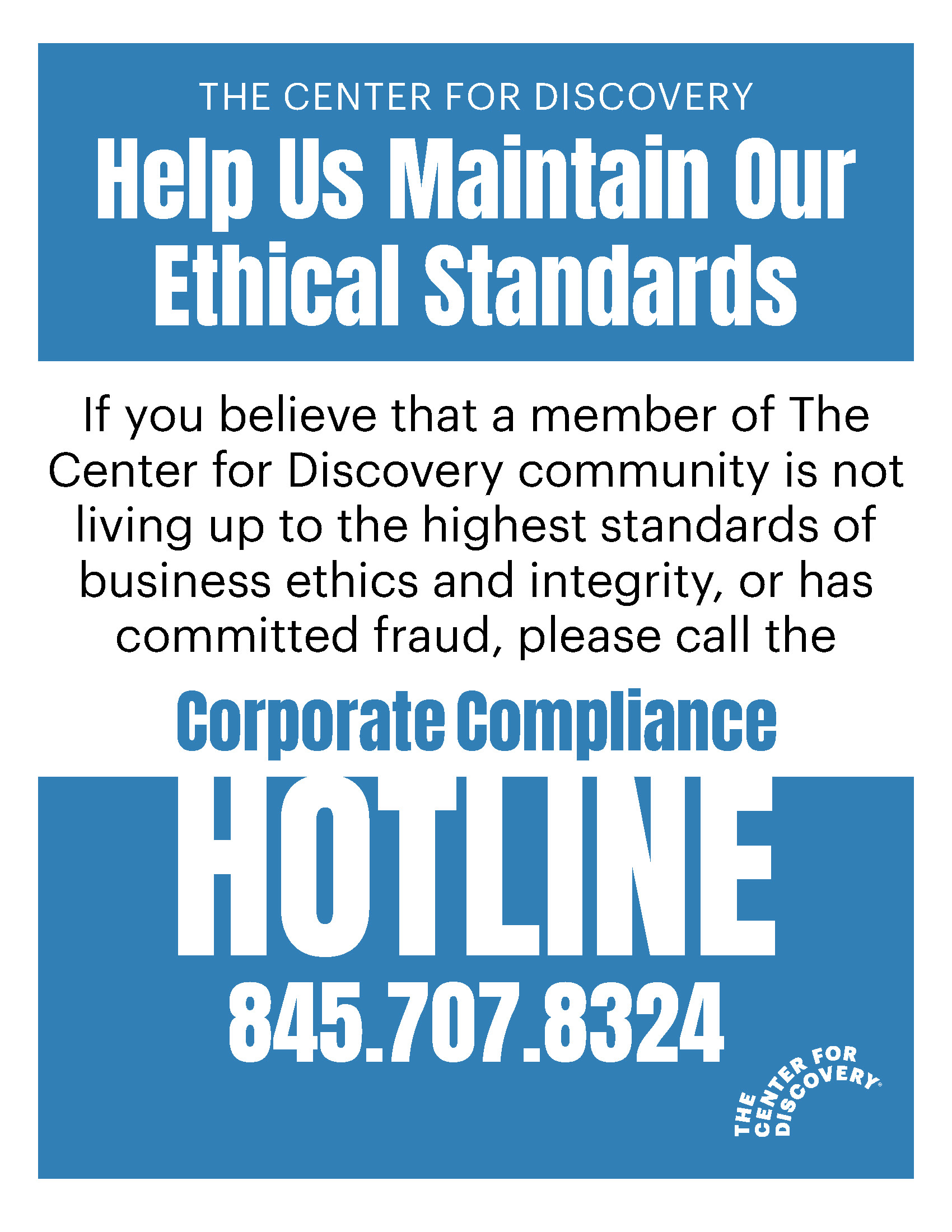 The Center for Discovery (TCFD) is committed to providing services of the highest quality and to being in full compliance with all federal, state and local laws and regulations. As part of that commitment, TCFD has adopted a Corporate Compliance Plan and the Standards of Conduct as the basis of its efforts in fostering a TCFD culture that promotes responsible and honest conduct, transparency in all business transactions, and adherence to the laws and regulations of the government oversight agencies and funders. By upholding the highest standards of compliance, TCFD is ensuring a better quality of life for those we support.